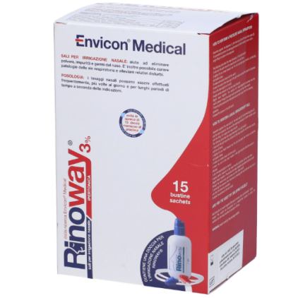 Rinoway doccia bimodale per l’irrigazione nasale per il trattamento della rinocongiuntivite allergica e le infezioni delle alte vie aeree con 15 bustine di sali ipertonici Rinoway 3%.
